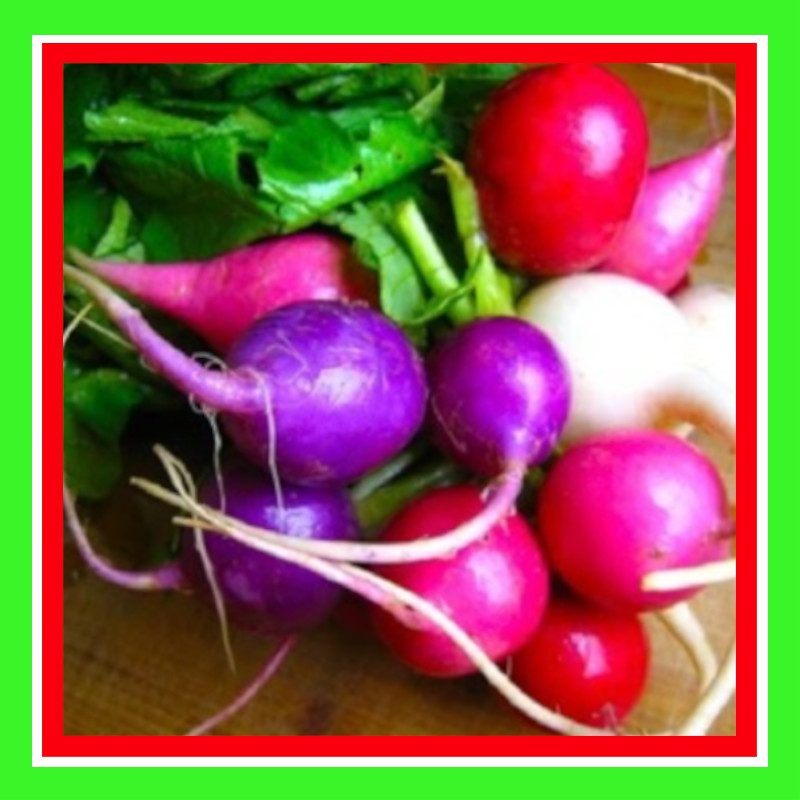 RADISH-EASTER EGG (treated) is fun for kids & adults alike to grow. The seeds produce a beautiful variety of colors, including red, white, pink, and purple all in the same pack! You won’t know which color the radish will be though until you uncover the soil for the first time to take a peek. Delicious both raw & roasted, these roots grow bigger than standard varieties and stay crisp & mild even when large.  Don’t discard the tops either as they are scrumptious when sautéed and incredibly nutrient dense!