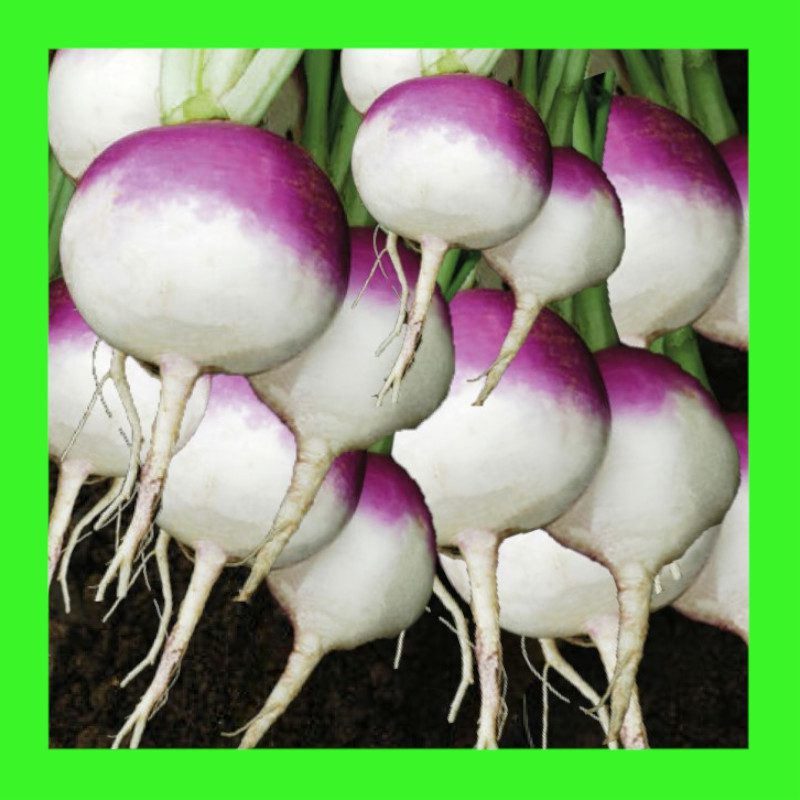 TURNIP-PURPLE TOP WHITE GLOBE dates back to the 1800s & has remained popular for its beautiful appearance, production quality, & ease of growth. This popular heirloom variety has a large purple to red top that fades into white on the bottom. It’s a tender, white-fleshed variety that grows quickly & keeps well, making it a top choice for home gardens. A popular early variety. The top reaches 10-12cm diameter. The young leaves can be cooked as greens & the flesh has an excellent flavor, ideal in soups & stews or enjoys them roasted or mashed like potatoes.